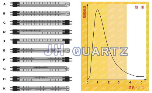 短波石英燈采用帶支架圈的鎢絲做輻射體,封閉在石英玻殼中,其波長范圍為 0.8-1.8 微米,在 1.2 微米時達(dá)到峰值。